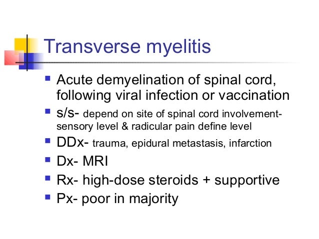 Transverse Myelitis Symptoms - Transverse Myelitis: Causes, Symptoms, Diagnosis ... - Sometimes there is no known cause.. The exact reason for transverse myelitis is not known. Mar 20, 2018 · transverse myelitis is a neurological disorder caused by inflammation of the spinal cord, which carries nerve signals from the brain to the rest of the body. Dec 12, 2019 · a doctor will diagnose transverse myelitis based on your answers to questions about your signs and symptoms, your medical history, a clinical assessment of nerve function, and test results. Transverse myelitis is a rare neurological condition involving inflammation of the spinal cord. With the help of testing and.